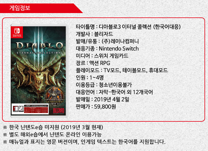 - 3일 조원희 레이나컴퍼니 공동대표 인터뷰 - 스위치용 ''디아블로3'' 국내 정식 발매로 화제 - 15년 콘솔 타이틀 유통.."호텔과 시너지 낼것" 닌텐도 스위치판 ‘디아블로3: 이터널 콜렉션’을 정식 수입 발매