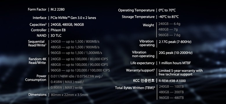 혹시 참고하실 분들을 위해 킹스톤 NVMe A1000 의 공식 스펙표를 첨부합니다.