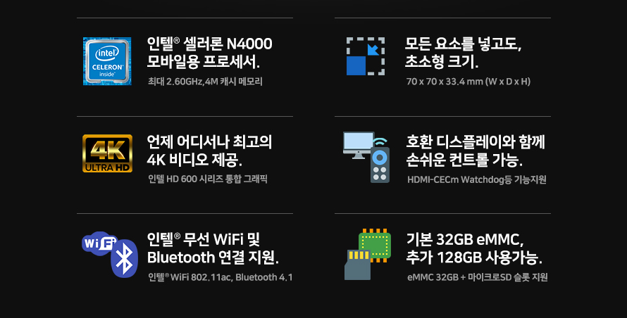 마찬가지로 가지고 있는 포트는 정말 한정 수량이다. 일단 디스플레이와의 연결을 위한 HDMI 풀사이즈 포트와 인터넷 연결을 위한 LAN 포트, 전원포트가 후면에 위치하고 있으며. 전면부에서는 USB 3.0 과 2.0 포트가 위치하고 있다. 측면부에는 마이크로 SD 카드를 연결하여 최대 128Gb 에 이르는 용량 확장이 가능하다.