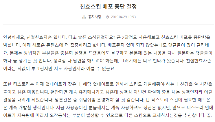 바로 4월 29일을 기점으로 하여 친효스킨 배포를 중단한다는 글입니다. 전체적인 맥락은 본문에 충분히 적혀있는 내용을 일부 적어보자면, 반복해서 달리는 댓글들이 문제였을까요. 예전에 친절한효자손 님과 같은 단톡방에서 잠깐 대화를 한 적이 있는데 글 하나하나 답변을 해 주시는 모습이 정말 좋았습니다. 그러한 성격이 좋으셔서 ㅠㅠ 결국 친효스킨 사용법에 대한 질문들을 하나하나 답변을 해주시다가 결국엔 현타가 왔다고 하십니다.. 다들 글 좀.. 본문좀 읽어보지 ㅠㅠ