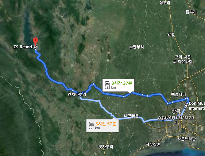 방콕으로부터 차로 약 3시간 ~4시간 거리 200km 에 있는 Sinakharin 라는 호수에 위치한 Z9 리조트.
