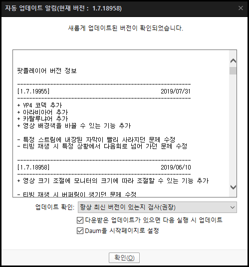 | 팟플레이어 버전 1.7.18344 업데이트 진행 (0) | 2019.04.18 |