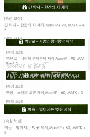 가구를 만드는 것만으로도 가구 자체와 함께 일종의 스탯, 혹은 공격력을 얻을 수 있습니다. 몇 가지 마공이 올라가는 것들을 추려봤습니다. 가장 저렴한 재료로 가구로 만들었을 때는 최소 1.5에서 최대 5까지 마법공격력 수치가 올라가는 것을 확인할 수 있었지만, 위의 추린 가구들을 전부 만든다면? 약 16에 해당하는 15회 해당하는 마공이 올라가는 것을 확인할 수가 있습니다. 위의 목록이 전부가, 공격력 부분에서만 70개에 달하는 가구들이 있으니 전부다 만든다면? 으마무시하게 오르죠.