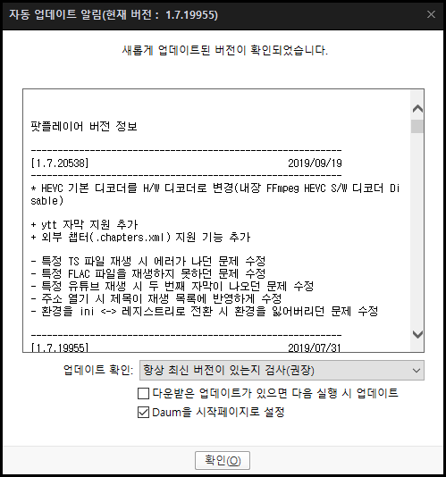 그리고 몇 가지 업데이트가 추가적으로 진행되었는데 개인적으로 노래를 재생할 때도 마찬가지로 다음팟플레이어를 사용 해서 재생 하기 때문에 FLAC 파일 재생불가 문제가 업데이트 된 점은 개인적으로 정말 극메입니다.