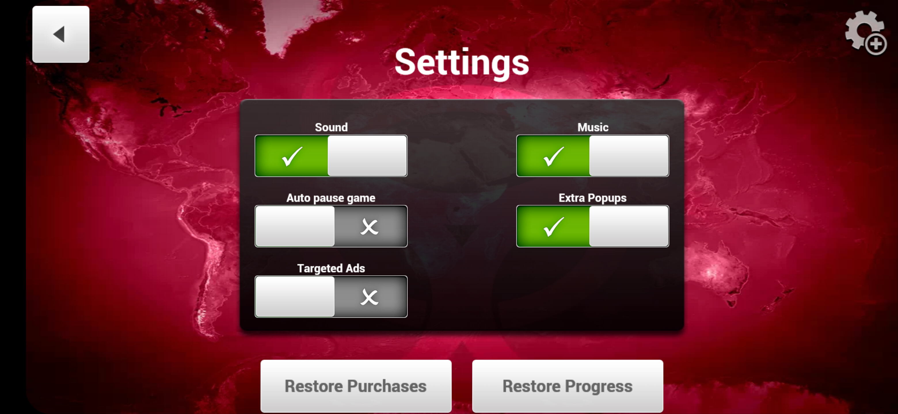 이후 나오는 Setting 페이지에루 우측 상단의 톱니바퀴를 다시 눌러줍니다. 그럼 아래와 같이 다시금 설정페이지가 나옵니다 여기서 언어 Language 를 우측 버튼으로 약 5~6번 정도 누르면 한국어 설넝이 나옵니다. Restore Porgress 를 눌러준 뒤 재부팅 하면 정상적으로 전염병 주식회사 Plague inc의 한글판 적용이 됩니다.
