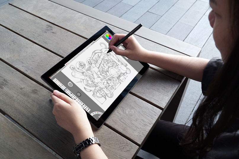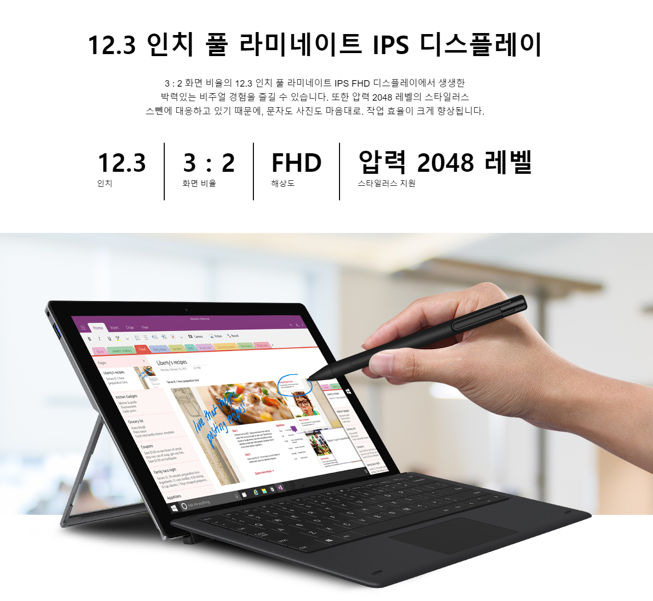 주요 성능은 다음과 같습니다. 인텔 코어 m3-8100Y, 3:2 비율의 1920x1080 해상도, IPS 패널, 12.3인치 스크린, 145도 각도 조절 킥 스탠드, 2048단계 필압 감지, 키보드 커버, 무게 780g, 두께 9mm, 킥스탠드 포함.