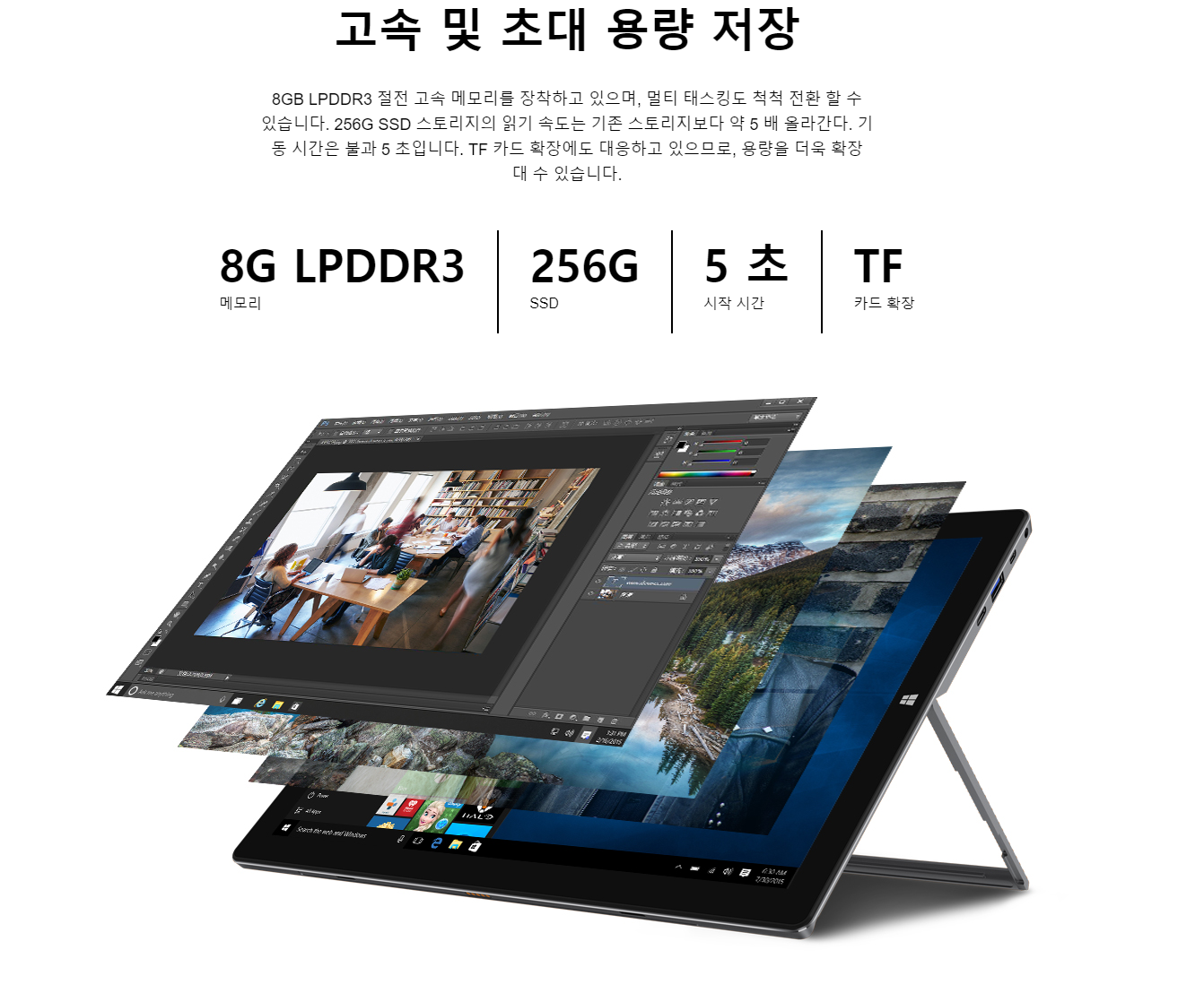 8GB LPDDR3 메모리, 256GB SSD, 윈도우 10 홈, USB 3.0 x2, USB C 포트, 마이크로 HDMI, 마이크로 SD, 음성 입출력.