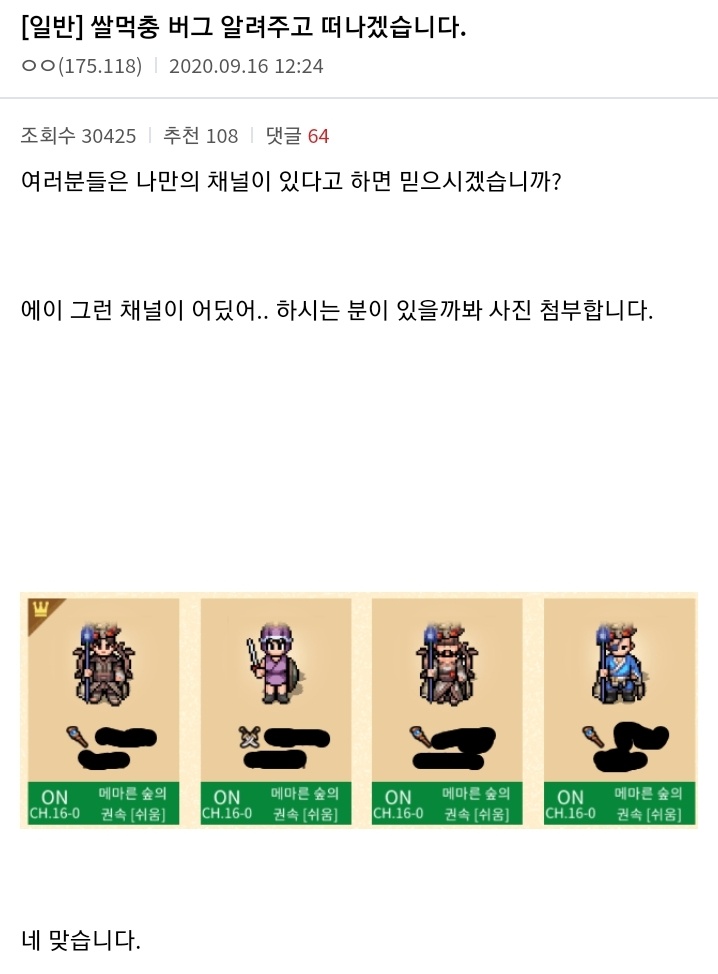 급하게 임시점검 들어간 바람의나라 연 늘 그렇듯 오늘은 또 무슨 버그일까 갤러리를 들어가봤다. 개인채널이 생성됨 ㅋㅋㅋㅋㅋㅋㅋㅋㅋㅋㅋㅋㅋ 근데 이게 작년부터 있었다? 쉽게요약한 익��