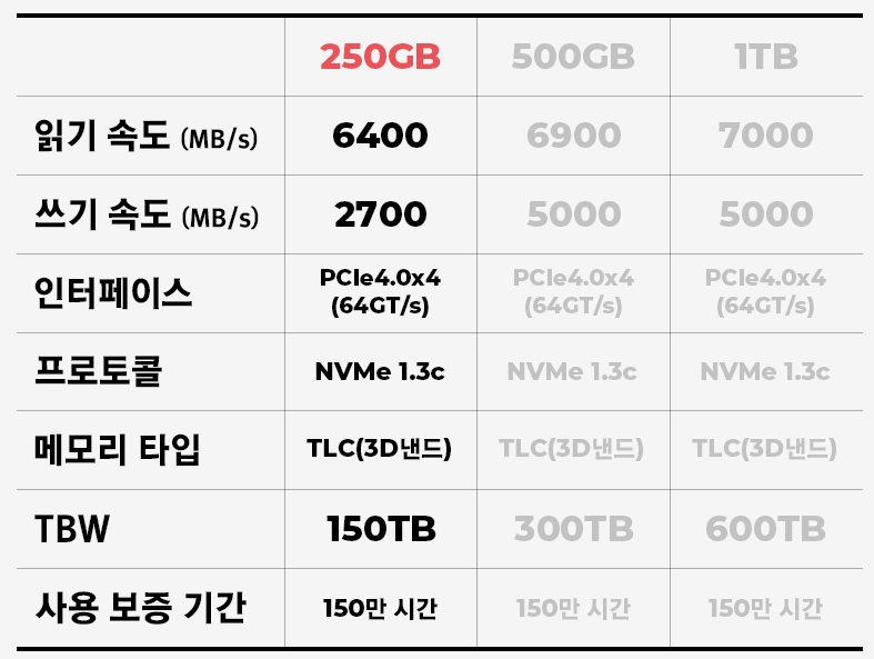 1TB 기준 읽기 속도 7,000MB/s 쓰기 속도 5,000MB/s