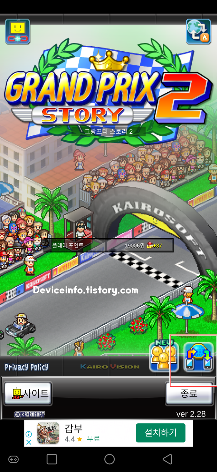 그랑프리 스토리 2 의 로딩을 기다리고 게임으로 접속하지말고, 메인 타이틀 화면 우측 하단에 보이는 스마트폰이 2개 그려진 버튼을 클릭하자.