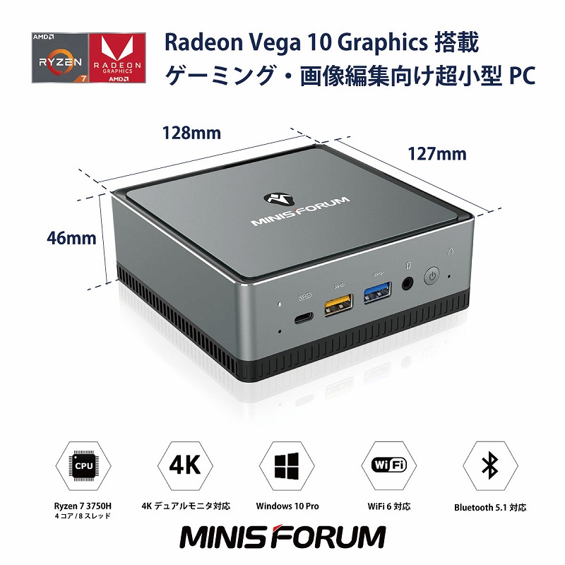 AMD Ryzen™ 7 3750H搭載 超小型デスクトップパソコン わずか128mm四方の超小型筐体 Radeon™ RX Vega 10 Graphics 搭載 Windows 10 Pro プリインストール ツールレスで増設できるワンタッチ開閉式天板 256GB M.2