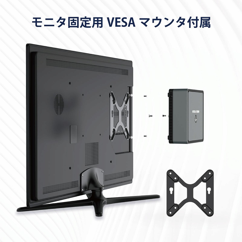 모니터와 TV의 뒷면에 고정 할 수있는 VESA 규격의 마운터가 표준 부속. 본체와 케이블을 정리함으로써 더욱 공간 절약 할 수 있습니다.