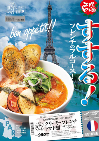 프랑스 요리의 풀 코스를 토마토 국수로 재현했다. 스프 속에서 녹는 볶은 카망베르와 치즈를 녹인 크림 같은 맛의 토마토 수프에 마늘 토스트를 담그고 맛본다. 다채로운 즐길 수 있는 프렌치 토마토면. 판매점포는 신주쿠 미로드점, 신주쿠 워싱턴 호텔 지점. 가격은 980엔.