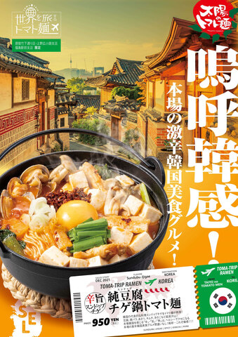 한국의 대표적인 요리 순두부찌개를 토마토면이 재현했다. 두부, 돼지 장미, 조개, 김치, 버섯 등 풍부한. 본고장 한국을 느끼는 '신', '맛', '열'은 건강하고 버릇이 되는 본고장의 격신한 한국 미식 음식이라고 한다. 판매점포는 하라주쿠 다케시타도리점, 후쿠시마역 앞 지점, 우에노 히로코지 지점. 가격은 950엔.