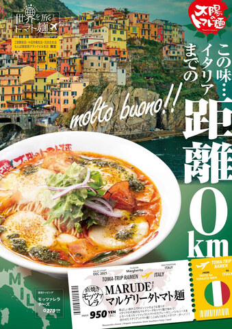 이탈리아의 대표적인 마르게리타를 토마토면으로 맛볼 수 있다. 볶은 모짜렐라와 토마토 카프레제에 바질 소스를 합친 이탈리안 토마토면. 판매점포는 난바 미도스지 그랜드빌 지점, 산노미야역 앞점, 토카이치 지점, 모토스미요시 지점. 가격은 950엔.
