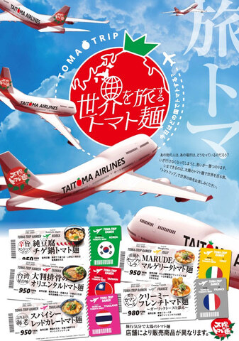 「세계를 여행하는 토마토면」은, 태양의 토마토면에서 첫 시도가 되는 상품 시리즈. 대만·한국·이탈리아·태국·프랑스의 세계 5개국을 이미지한 5개의 상품을 점포에 따라 상품이 다른 형태로 판매한다.
