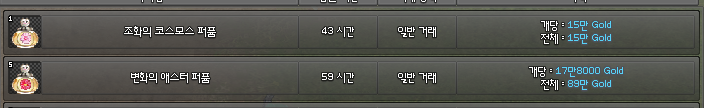 아니 근데 사실 이건 별거 아니다. 더 큰 문제는 더 있다, 각 교환소 최상위 물물교환에 조화의 코스모스 퍼퓸 5개 와 같이 퍼퓸이 각각 5개 씩 필요하다. 즉 3개 교역소를 모두 돌기 위해서는 부캐/부계 농장을 운영하며 1주일에 3번 이상은 아이템으로 교환하여 옮겨 줘야 한다는 것.