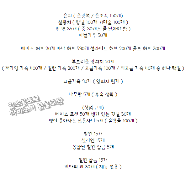 은괴 ( 은광석 / 은조각 150개) 실뭉치 ( 양털 100개 거미줄 100개 ) 빈 병 35개 ( 중 30개는 물 담아야 함 ) 마법가루 50개 베이스 허브 30개 마나 허브 590개 선라이트 허브 200개 골드 허브 300개 부드러운 양피지 20개 ( 저가형 가죽 400개 / 일반 가죽 200개 / 고급가죽 100개 / 최고급 가죽 40개 중 하나 택일 ) 고급가죽 90개 ( 양피지 별개 ) 나무판 5개 ( 부속 생략 ) (상점구매) 베이스 포션 50개 생기 있는 깃털 30개 펫이 좋아하는 잡동사니 5개 ( 솔방울 100개 ) 코스모스 추출액 10개 ( 솔방울 100개 ) 힐웬 15개 실리엔 15개 융합된 힐웬 합금 5개 힐웬 합금 15개 악마의 괴 30개 ( 재능 전용 ) |