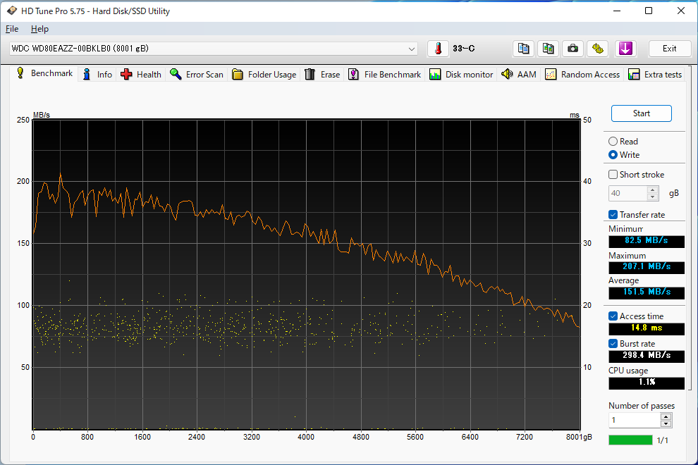 HD Tune Pro 5.75에서는, 외주로부터 내주까지의 속도를 측정하는 「Benchmark」로, 리드 속도와 라이트 속도를 각각 측정했습니다.