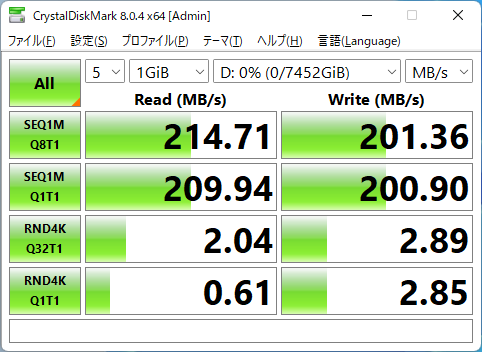 테스트 사이즈를 크게 하면, 랜덤 액세스 성능에는 저하가 보이지만, 순차 액세스 성능은 거의 변화하지 않고, 리드 210MB/s 전후, 라이트 200MB/s 전후라고 하는 속도를 기록하고 있습니다. 회전수 5,000rpm대의 HDD로서는 좀처럼 속도라고 할 수 있는 수치입니다.
