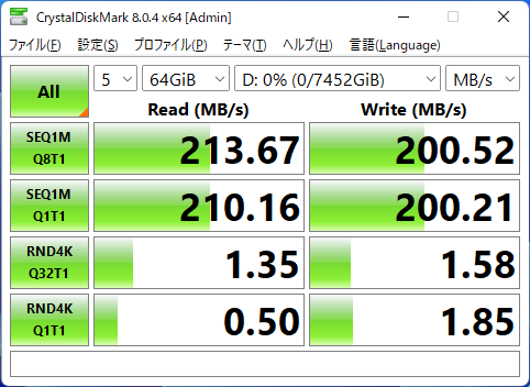 스테디셀러 디스크 벤치마크 「CrystalDiskMark」에서는, 디폴트 모드로 테스트 사이즈를 「1GiB」와 「64GiB」로 해 실행한 결과를 취득했습니다.