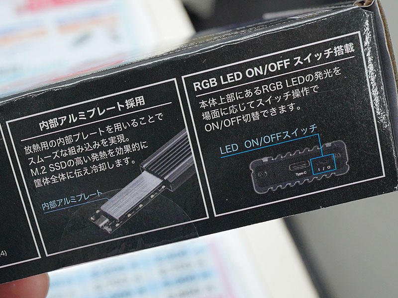 6색으로 발광하는 RGB LED를 갖춘 M.2 SSD용 알루미늄 케이스. 매장 가격은 5,480엔.