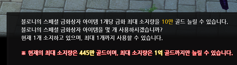 마찬가지로 블로니의 스페셜 금화상자 역시 사용 가능한 아이템으로 변경이 되었습니다, 다른 스페셜 금화상자랑 비슷하게 최대 10만 골드까지 한도 수량 를 늘릴수 있게 되었습니다. 블로니 와의 추억이 또 사라집니다.