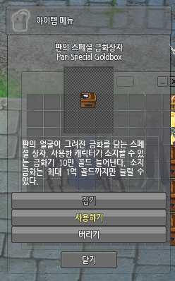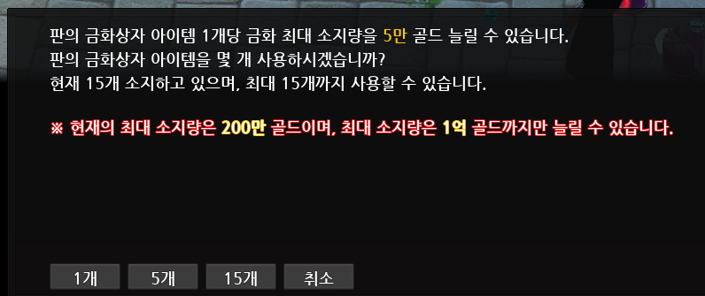 그리고 기존에 5만, 10만 골드까지 보관이 가능하던 금화상자는 이제 사용하기 버튼이 생기면서 사용가능한 액티브 아이템으로 변환되었습니다. 이를 사용하면 아래와 같은 창이 뜨면서 현재 캐릭터의 상태와 사용 갯수를 안내하는 창이 뜹니다. 생각외로 이 부분 인터페이스가 간편하고 하나하나씩 사용하는 것이 아니라 한 번에 처리되는 부분이 좋았습니다.
