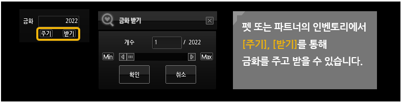 2. 펫 또는 파트너의 인벤토리에서 [주기]나 [받기] 버튼을 눌러 금화를 주고 받을 수 있습니다. (금화를 집어 직접 넣을 수도 있음)
