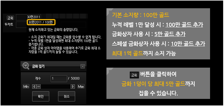 4. 금화 최대 소지량은 최대 1억 골드입니다.