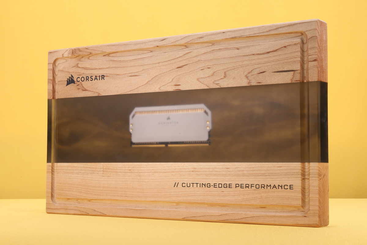 완충재를 꺼내 보면, 상자의 바닥에 담겨 있던 것은 목재와 레진을 조합한 플레이트로, 중앙부의 레진 부분에 DOMINATOR PLATINUM RGB의 화이트 모델이 내장되어 있었다. 플레이트에는 CORSAIR의 로고와, 「//CUTTING-EDGE PERFORMANCE」라고 하는 일문이 새겨져 있어, 이 메모리 킷이 최첨단의 퍼포먼스를 가져오는 것임을 나타내고 있다.
