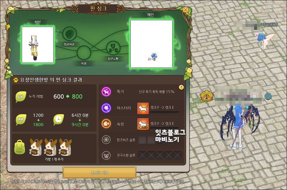 펫 싱크로 싱크해줄 펫은 요정펫이 선택되었습니다. 왜? 라고 한다면 채집이 주된 컨텐츠이다보니 요정펫을 소환하고 있는 시간이 많더라구요. 아무래도 마비노기 요정펫 소환시 이동/채집속도 증가는 굉장한 메리트가 됩니다. 특히 채집속도가 말이죠.