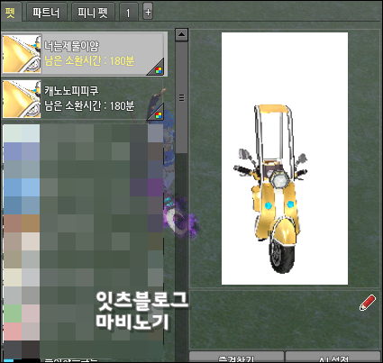 캐노피스쿠터 1마리는 소환시간 3시간으로 , 펫 싱크시 요정펫의 싱크 시간을 동일하게 3시간 늘려줍니다.