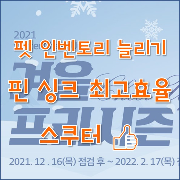 한 번 더 ㄱㄱ. 윈터시즌 펫인 캐노피 스쿠터 2개를 모두 펫 싱크하여 시간과 인벤토리를 모두 늘려줍니다. 펫 싱크시 인벤토리는 바로 적용이 되나, 소환시간은 다음날 오전 7시를 기점으로 적용됩니다. 펫 싱크시 재료로 소모되는 펫 인벤토리는 비어있어야합니다.