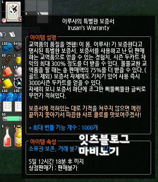 기왕 밀수하는 것, 앞서 말했던 것처럼 이루샤의 교역보증서를 사용했다.이루샤의 교역 보증서의 경우 수익이 3배가 된다. 300%. 지금은 300% 의 교역보증서가 일부 유저들만 한정적으로 가지고 있거나, 최근에는 이루샤의 보증서가 이벤트에서 거래불가 아이템으로 제한적으로 풀렸다.