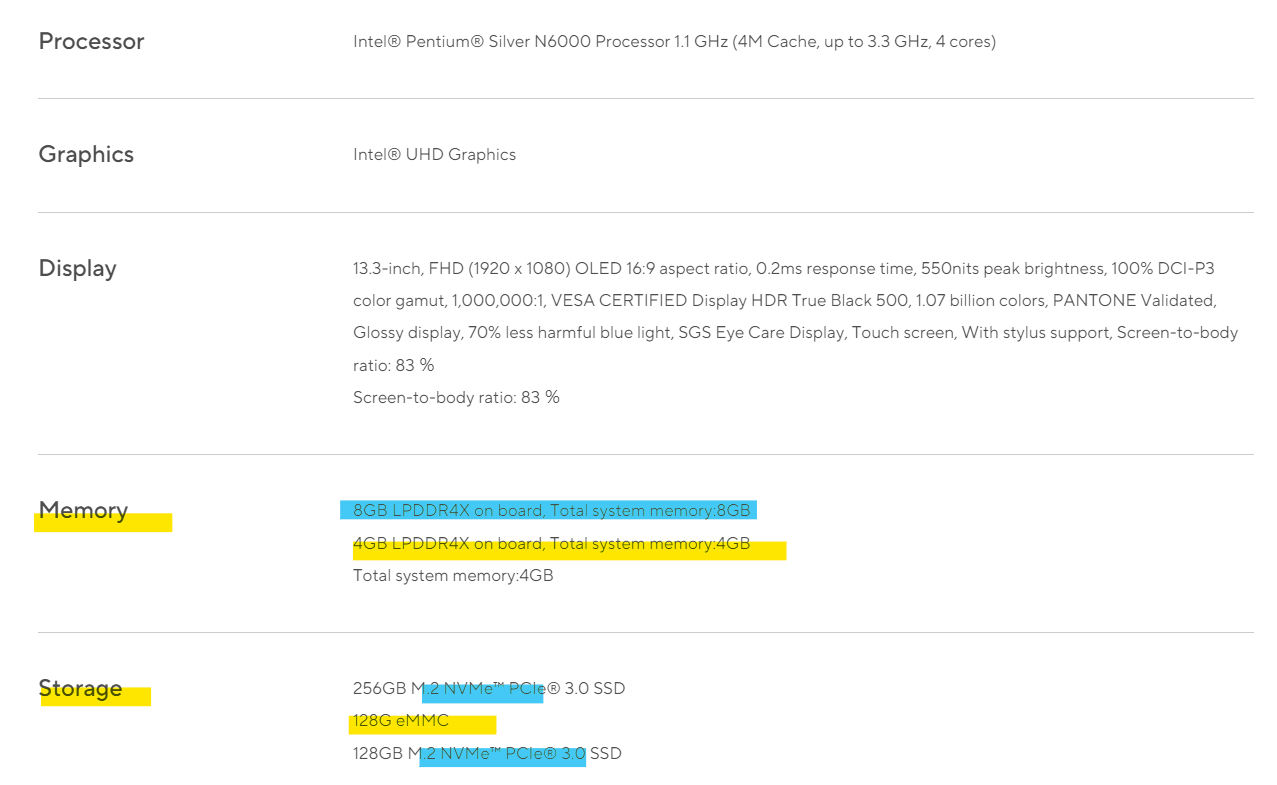 13.3인치, 550Nit 급의 OLED 터치스크린을 지원하며, 10-BIT, DCI-P3 100% .이거 맥북프로급에 탑재되는 디스플레이에 맞먹는 디스플레이 아닌가? 한데 왜 4GB 에 eMMC 를 박아서 출시하냐고.