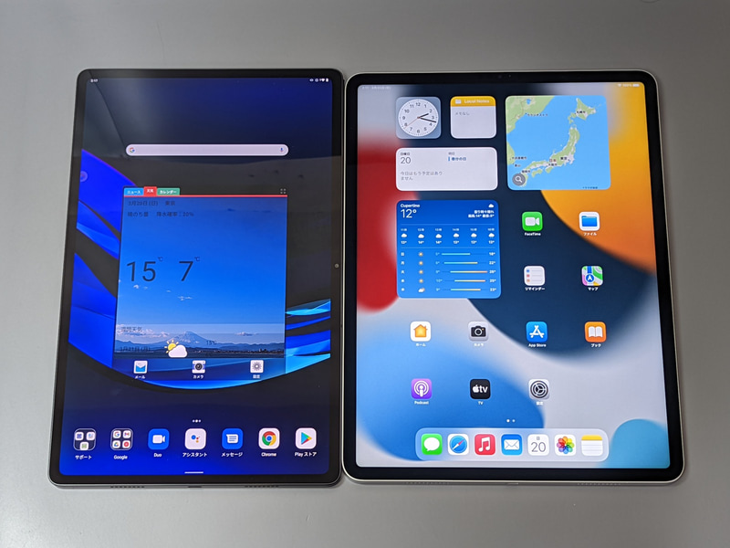 본 제품은 12.6형이라는 것으로써 화면 사이즈로 말하면 라이벌은 12.9인치 iPad Pro이다.우선 이 두 제품을 비교하시오.OS가 다른 디바이스 간 비교되는 항목에 따라서는 비교가 걸맞지 않은 경우도 있다는 점에 유의하기 바란다.