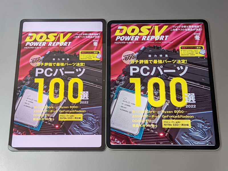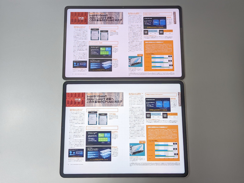 "DOS/V POWER REPORT"는 A4의 천지를 줄였던 A4변형 판이니, 세로의 본 제품에서는 상하로 큰 여백이 있다 다만 좌우 양면에서 옆으로 2페이지 정렬시키면 횡장의 화면에 밀착되며, 여백은 거의 못한다.상하로 큰 여백이 생기12.9인치 iPad Pro(아래)으로 표시 크기는 거의 같아진다.