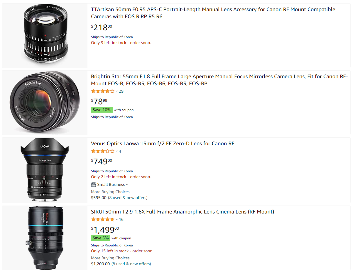 그래서 혹시나 싶어서 캐논 RF 마운트, 풀프레임 미러리스 카메라 종류에서도 사용이 가능한 비슷한 렌즈들이 있지 않을까? RF마운트 수동렌즈들을 한번 찾아보니 역시나 AF 를 지원하지는 않아도 나름 몇 종류가 되는 렌즈들이 있다는 것을 확인할 수 있었다. 막 엄청나게 많은 편은 아니지만