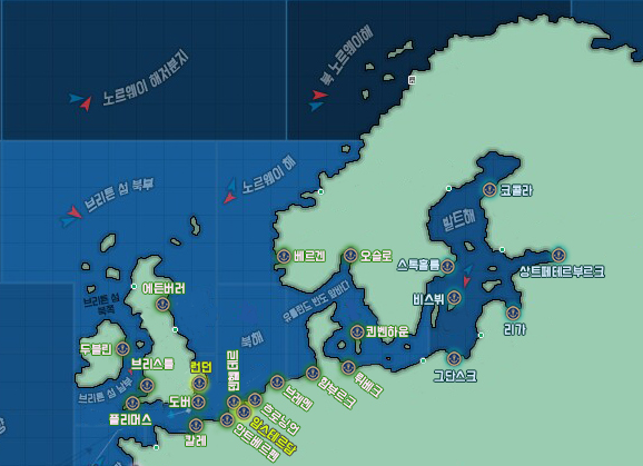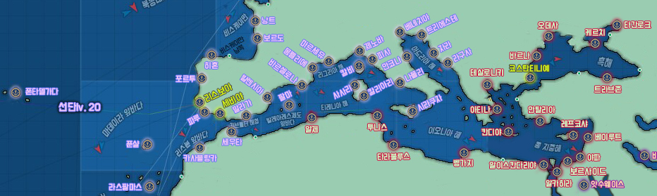 대항해시대 오리진 유럽 지도 ( 선단레벨 30레벨 이내 이동 가능지역)