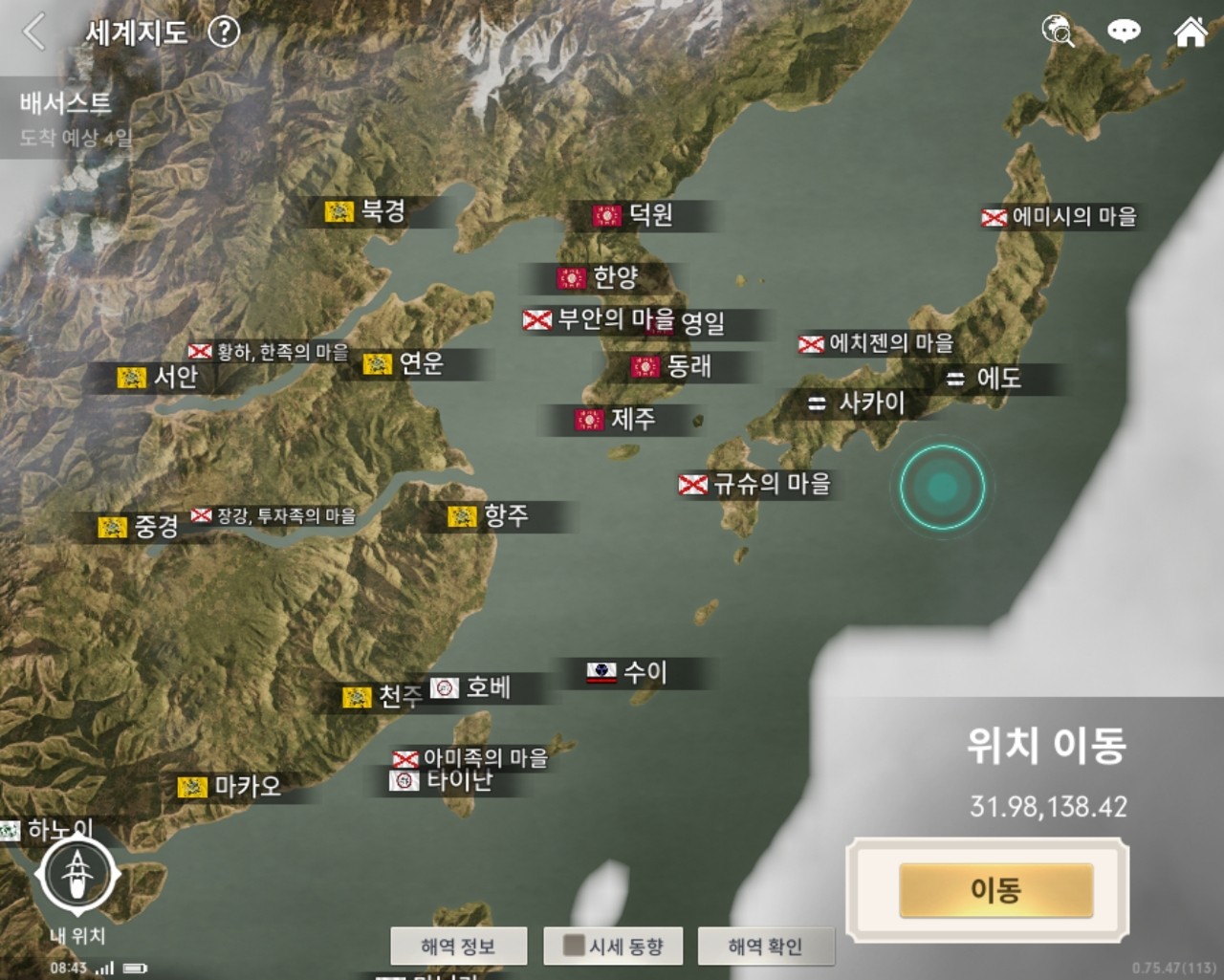 2차 CBT 당시 도입된 대항해시대 오리진 아시아 입니다. 정식오픈을 하면서 일부 바뀐 위치가 있을 수도 있으며 이용하시는데 참고하시길 바랍니다. 오픈 초기 아시아로 이동하기 위해서는 선박 성능이 많이 부족할 것이며, 이동하는 것에 한계가 있을 수 있습니다. 30레벨 이상 레벨을 진행한 후 이동하기길 바랍니다.