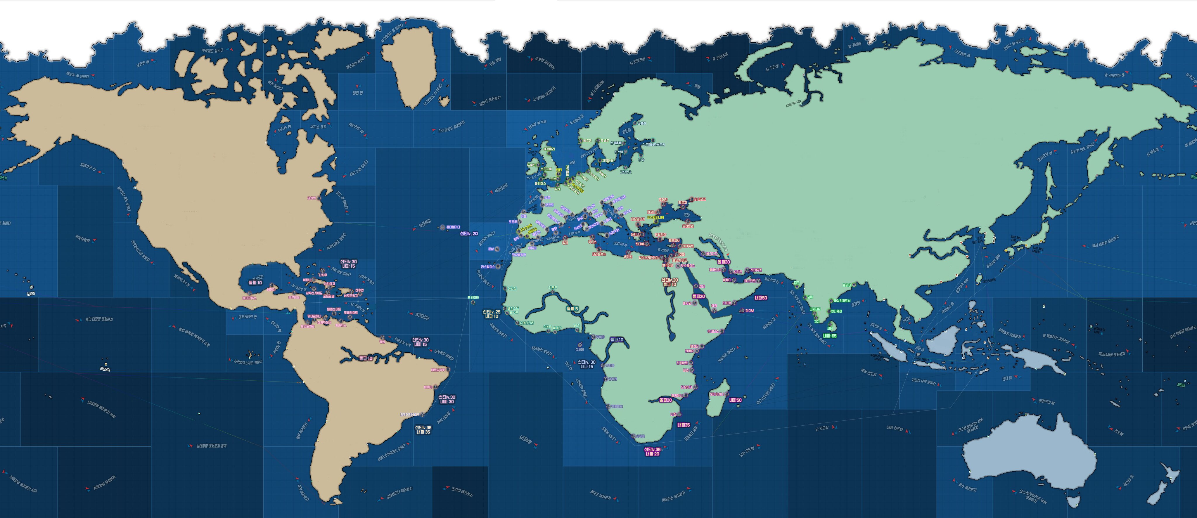네이버 대항해시대 오리진 유저 '가랑'님께서 제작하신 호주서버 기준 월드맵 입니다. 제 기준으로도 이 지도가 가장 정확하고 보기 편한 것 같습니다.