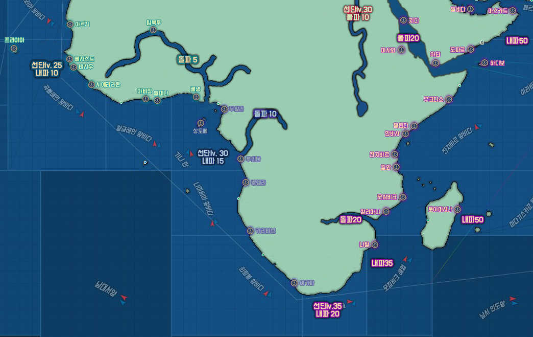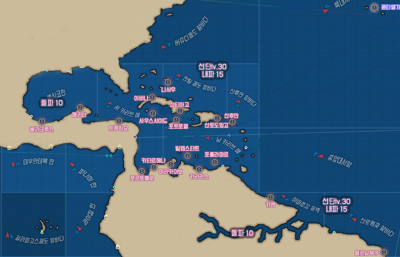 30레벨 이내에 이동 가능한 구간 입니다. 일부 지역은 느린속도로 이동이 가능하나 정상적으로 이동하기 위해서는 선단레벨 30 이상, 혹은 쇄빙 돌파 돌파 조파 등의 옵션을 특정 수치 이상 올려야 정상적인 항해 / 이동이 가능합니다.