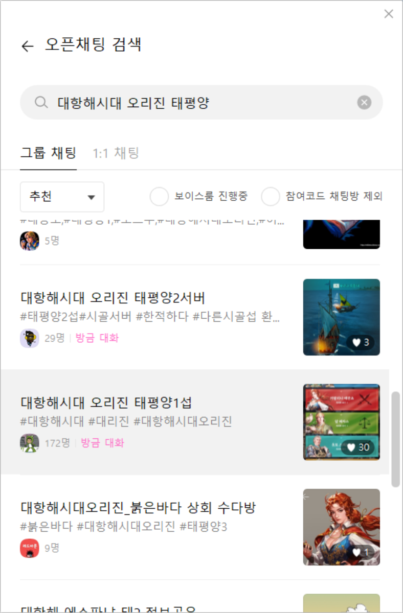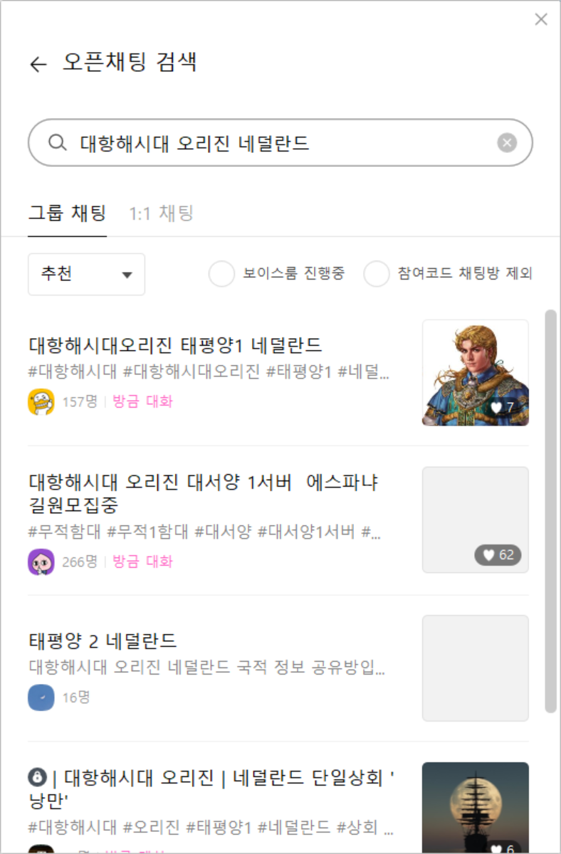 카카오톡 오픈 채팅도 대항해시대 오리진 이라는 키워드를 기반으로 뒤에 나라 혹은 서버를 입력해서 해당 채팅방에서 오가는 정보들을 공유하고 정보를 얻는 방법이죠. 도시 간 항해하는 동안의 시간을 때울 수 있다는 점도 있습니다.