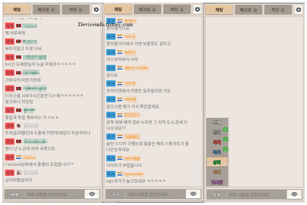 다만 세계 채팅하는 워낙 빠르게 올라가고 매일 싸우고 있고, 욕하기 때문에 개인적으로 추천 하지 않습니다. 그나마 국가 채팅이 두번째로 활발하고 정보들이 오가기 때문에 쉽게 확인할 수 있습니다.
