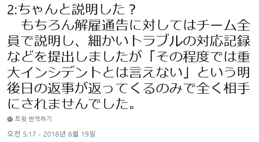 물론 해고통지를 받았을 때 팀 전원이 세세한 트러블 대응 기록을 제출했으나 이틀 뒤 [그 정도는 중대사건이라고 할 수 없다] 는 답변만 받고 개무시