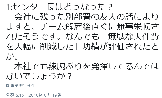 회사에 남아있던 타부서 사람이 해준 말에 의하면 팀 해고 직후 곧바로 승진했다는 듯.\
