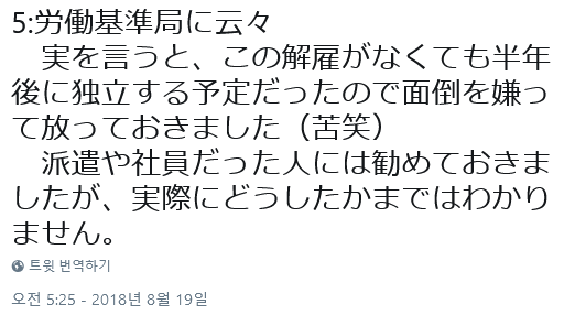 솔직히 말하면, 해고되지 않았더라도 반년 뒤 독립할 예정이어서 귀찮은 일을 피하고자 그냥 되는대로 둠. 파견직이나 직원이었던 사람들에게는 추천해두었지만 실제로 어떻게 됐는지는 모르겠음.