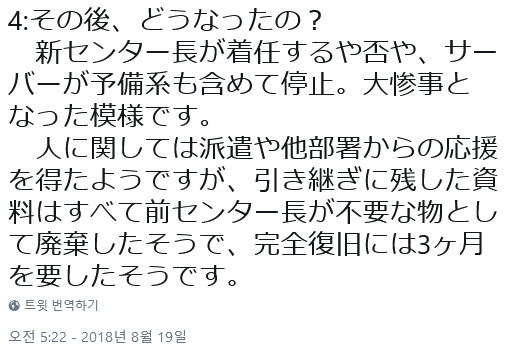 새로운 센터장이 취임하자 마자 서버가 예비를 포함하여 올스톱, 대 참사가 터졌다는 모양. 사람은 파견직을 쓰거나 타부서의 도움도 받았으나 인수인계용으로 남겨둔 자료는 전부 전 센터장이 [필요없는 것들]이라고 폐기시킨 듯 하여, 완전 복구에는 3개월정도가 필요했다는 듯.