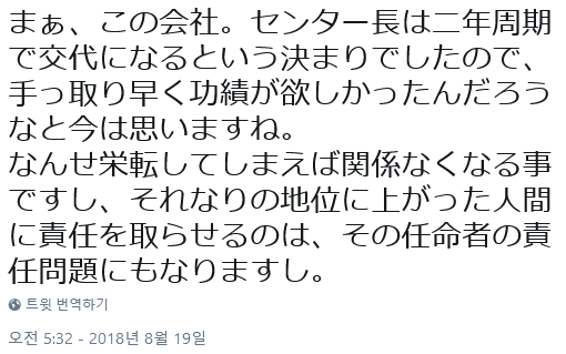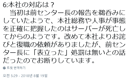 처음엔 전 센터장의 보고를 그냥 흘러넘긴 듯, 본사 총무나 인사과가 사태를 파악한 건 서버가 사망한 이후였던 것 같음. 본사에서 사죄와 복직권유가 있었지만 전 센터장에 표면적인 처벌은 없다고 들어서 거절함.